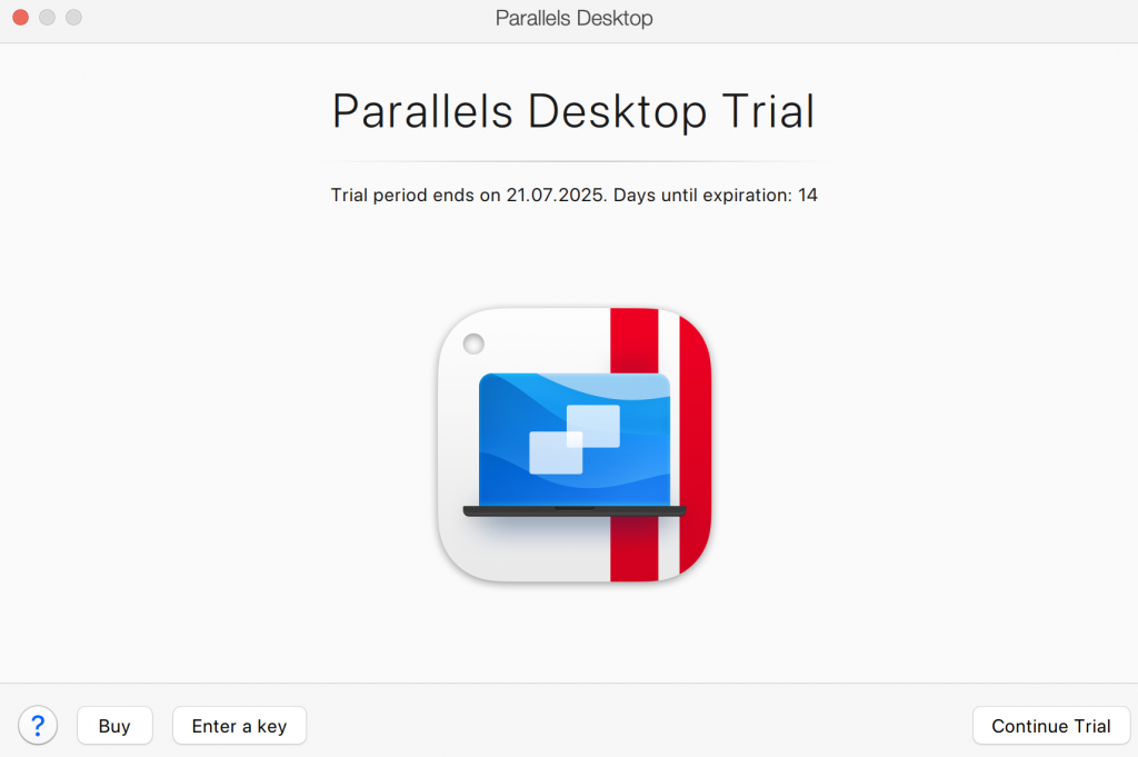 В Parallels Desktop предусмотрен бесплатный 14-дневный период для тестирования приложения без ограничений функционала. По окончании пробного периода необходимо купить подписку.