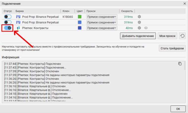 Примечание: пользователи CScalp могут торговать не нескольких счетах Phemex одновременно, благодаря функции мультисчетов. Подробнее об этом читайте здесь.