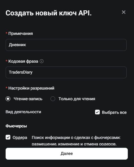 Мы рассмотрим торговое подключение на примере «Фьючерсы USDT-M». Кликните в поле нужного подключения. Введите API-ключи в поля «ApiKey» и «ApiSecret». Укажите пароль, который вы установили при создании ключей. Кликните «Далее».
