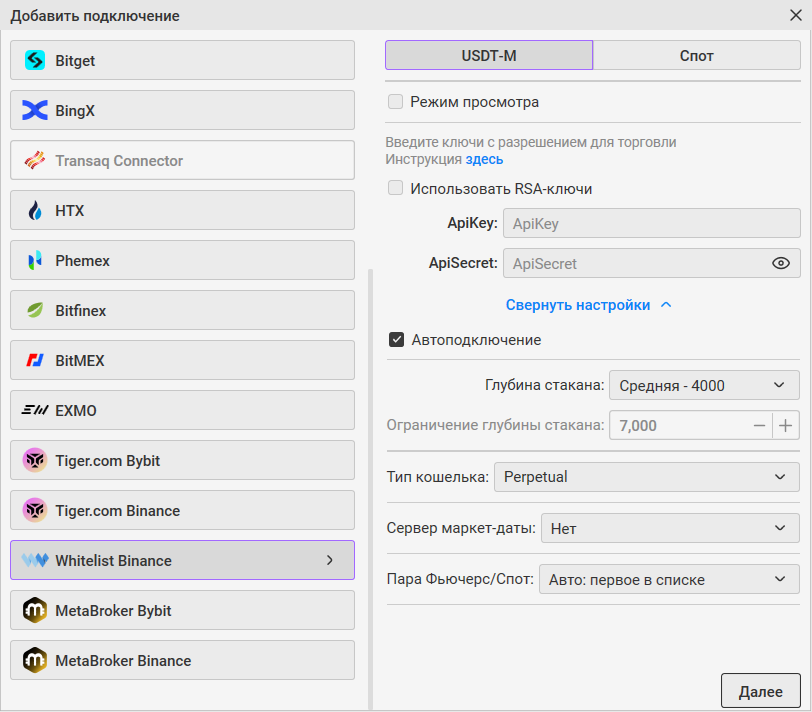 Выберите площадку – спот или бессрочных Фьючерсов. Для торгового подключения введите «API-ключ» и «Секретный ключ» в поля «ApiKey» и «ApiSecret» соответственно. Кликните «Далее».