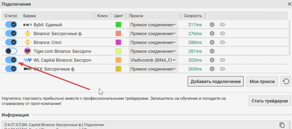 В CScalp откройте раздел «Подключения». Кликните «Добавить подключение». Прокрутите ползунок доступных подключений к биржам вниз. В открывшемся окне выберите подключение к «Whitelist Binance».