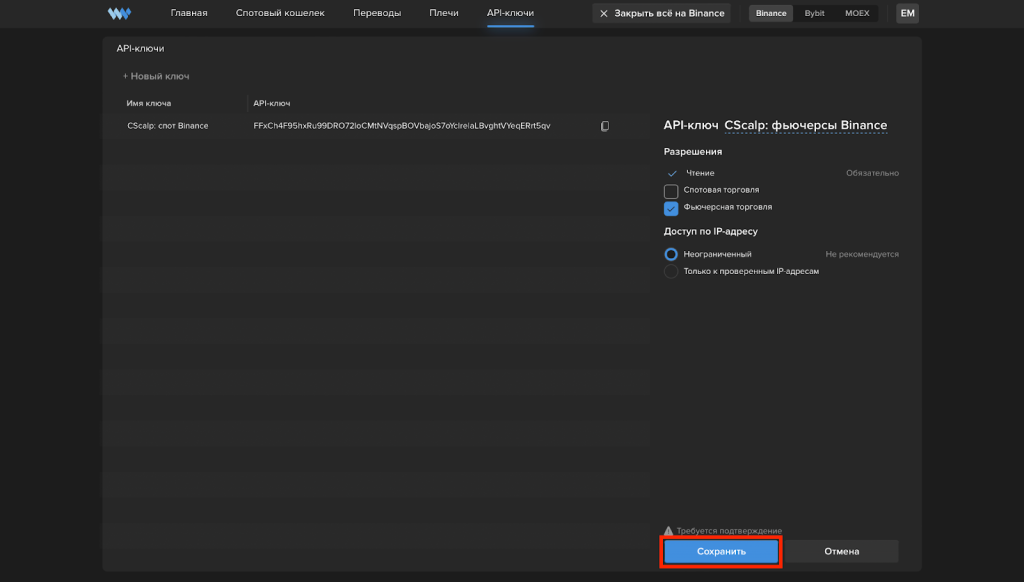 Задайте название связки ключей и включите торговые параметры. Например, «Фьючерсная торговля». Вы можете создать одну связку API-ключей для спотового и фьючерсного рынков Binance или отдельные связки под каждый рынок. Кликните «Сохранить».