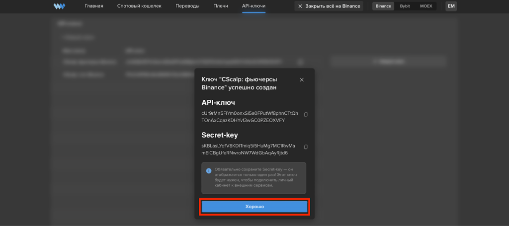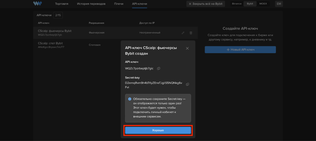 Важно! Никогда не передавайте ключи API третьим лицам.