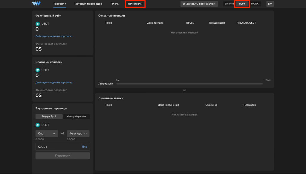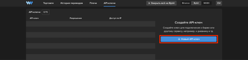 В личном кабинете WL Capital откройте раздел «Bybit» и кликните «API-ключи».