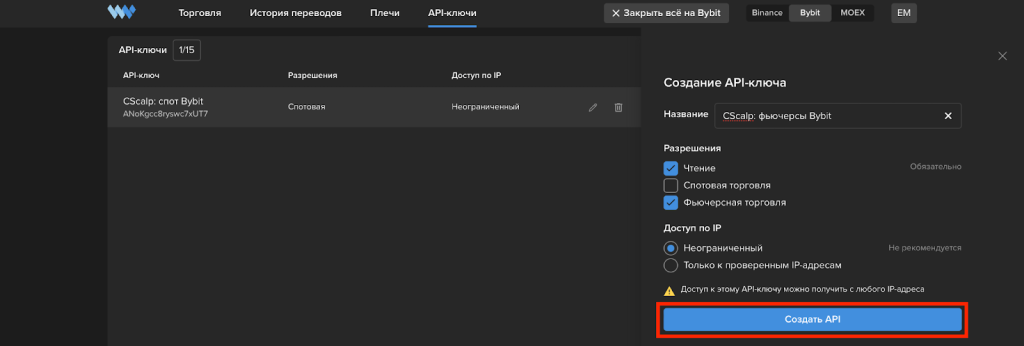 Укажите название для связки ключей и выберите торговые параметры. Например, «Фьючерсная торговля». Вы можете создать одну связку API-ключей для спотового и фьючерсного рынков Bybit или отдельные связки под каждый рынок. Кликните «Создать API».