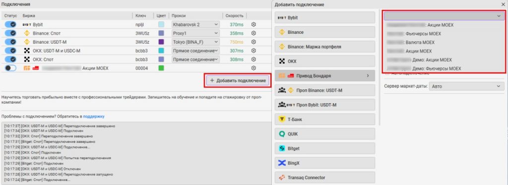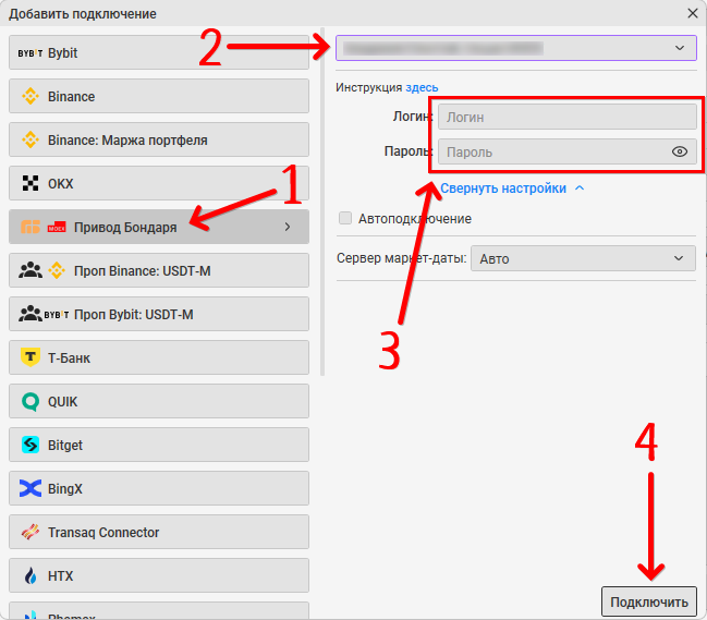 Находим подключение “Привод Бондаря”. В выпадающем списке выбираем площадку, водим логин и пароль, кликаем “Подключить”.