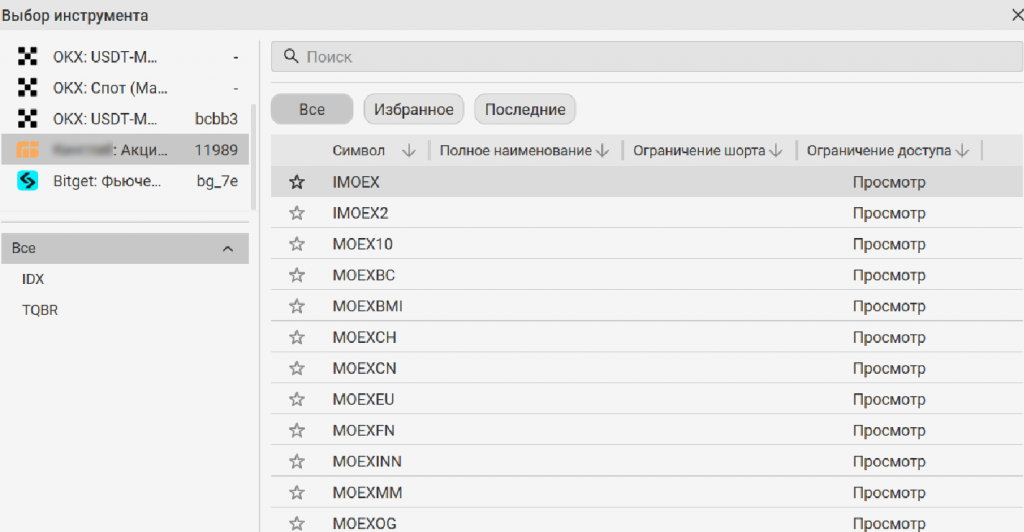 Нажимаем на область экрана, чтобы выбрать инструмент для торговли в боковом меню открывшегося окна указываем подключение, для которого хотим выбрать инструмент.
