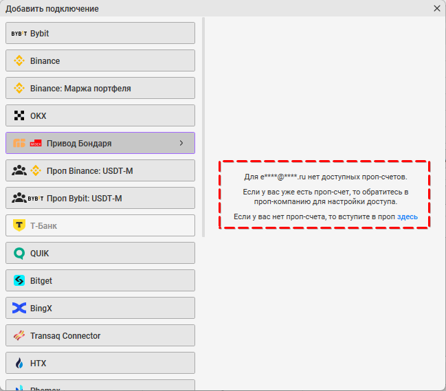 Чтобы подключиться к нескольким Проп-компаниям и вести торговлю одновременно необходимо убедиться что во всех пропах указана одна и та же почта для регистрации. Чтобы сделать это необходимо написать вашему руководителю или куратору в проп-компании. После этих действий вы сможете выбрать ваш счет из любого подключенного пропа