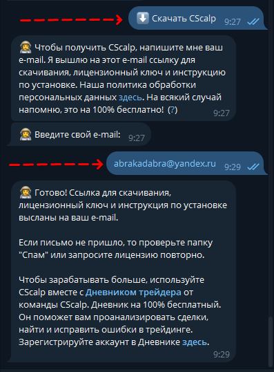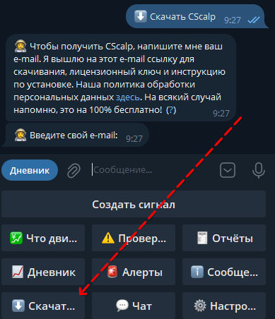 Чтобы получить лицензию через Telegram, запустите бота @CScalp_bot. Введите команду /cscalp или кликните «Скачать».