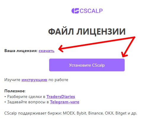 На почту придет письмо от команды CScalp с установочным файлом (дистрибутивом) и лицензионным ключом. Если терминал не скачался автоматически, кликните «Установить CScalp», чтобы загрузить дистрибутив.