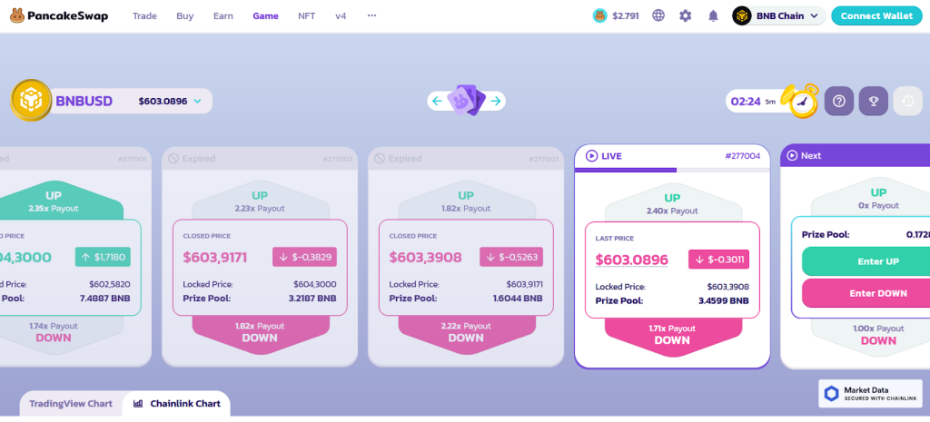 На PancakeSwap есть раздел Prediction – тотализатор на изменение цены CAKE/USD. Мы можем поставить на повышение или понижение цены инструмента. Если угадываем, получим указанный коэффициент.