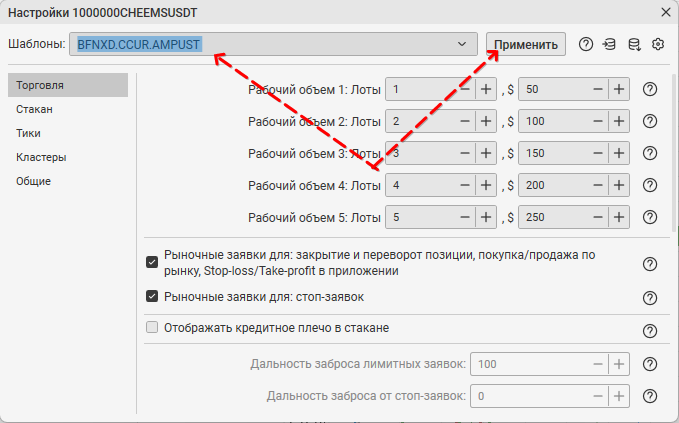 Чтобы применить настройки торгового инструмента из шаблона, откройте настройки нужного биржевого стакана. Перейдите к списку шаблонов, выберите нужный, откройте его и кликните «Применить». Настройки шаблона применяется к выбранному биржевому стакану.
