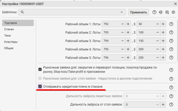 - Ошибку параметра «Сокращать тысячи объемов в стакане»