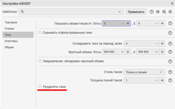 Обновили настройки тиков в ленте сделок – добавили параметр «Разделять» тики в настройки торгового инструмента (вкладка «Тики»). С включенным параметром тики не «наслаиваются» друг на друга.