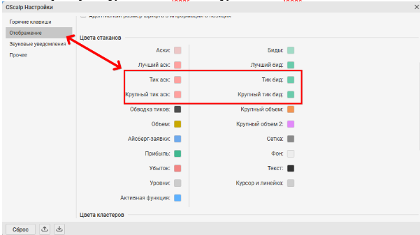 Также добавили возможность изменить цвет тиков, подпадающих под параметр «Крупный объем». Чтобы настроить цвет тиков с крупным объемом, откройте «Настройки», перейдите во вкладку «Отображение» и задайте параметры «Крупный тик аск» и «Крупный тик бид».