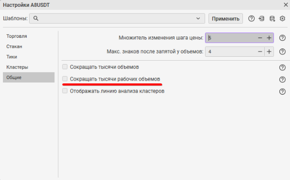Добавили параметр «Сокращать тысячи рабочих объемов» в настройки торгового инструмента (вкладка «Общие»). Включите параметр, чтобы сократить визуальное отображение рабочих объемов.